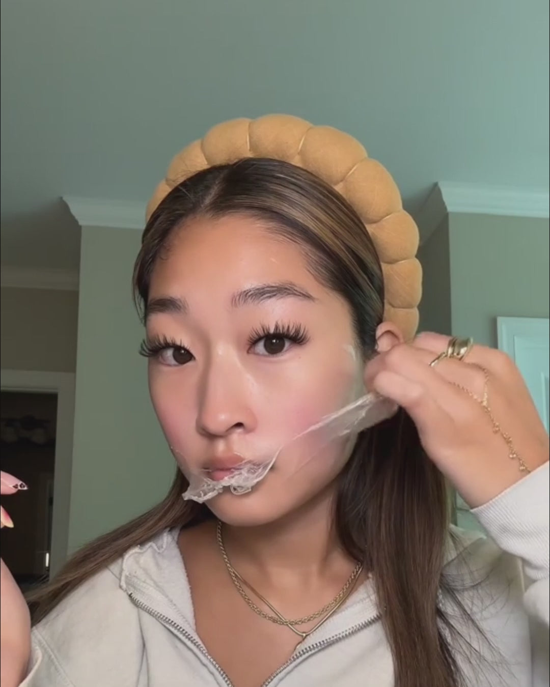 In the morning, gently peel the mask off in one piece. No rinsing required. Reveal your glass skin glow.