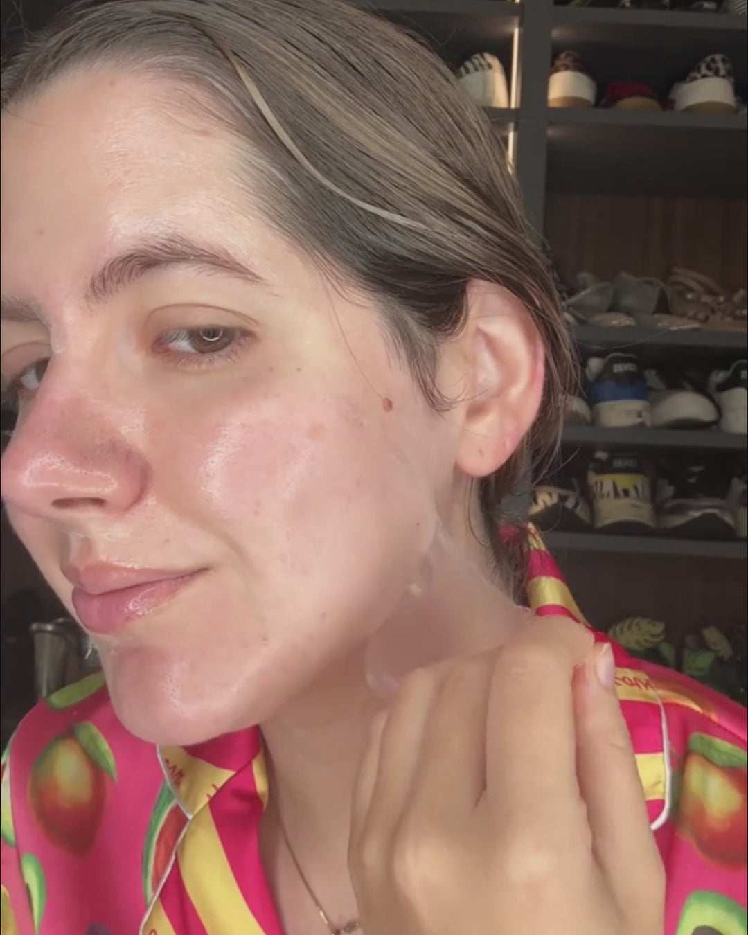 After your serums, apply a generous layer using the silicone brush. Ensure full coverage on cheeks and forehead.